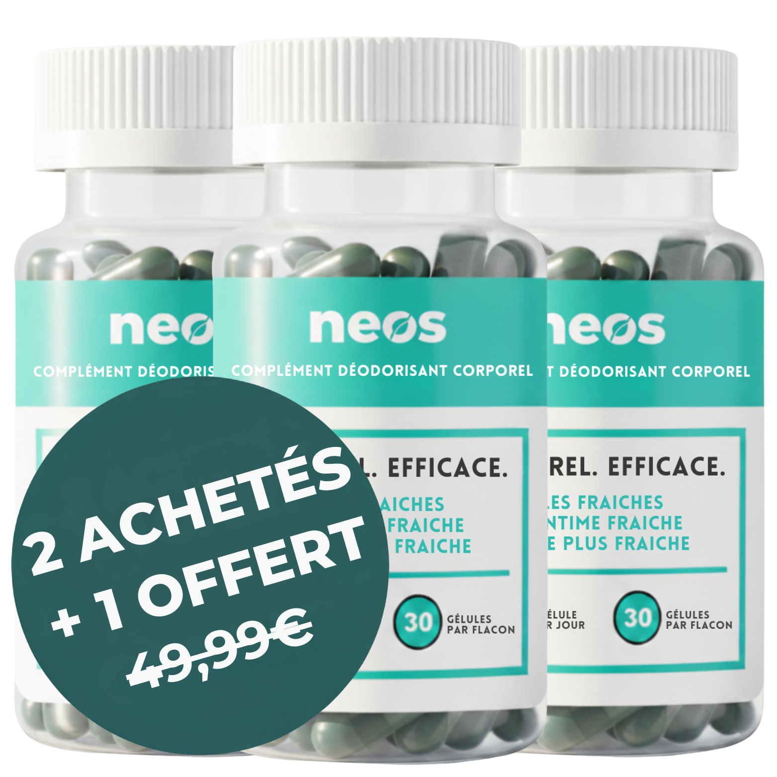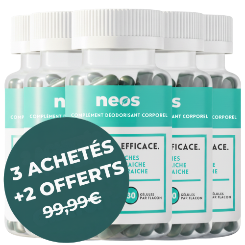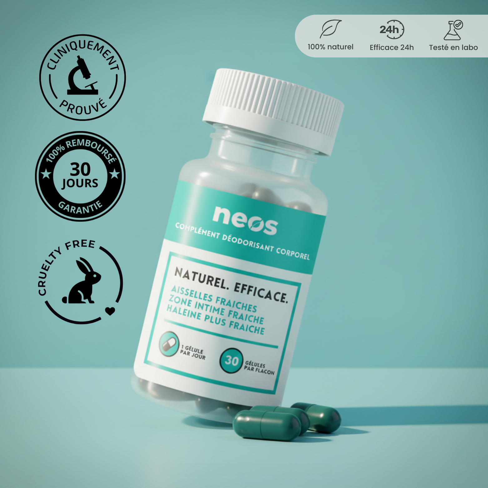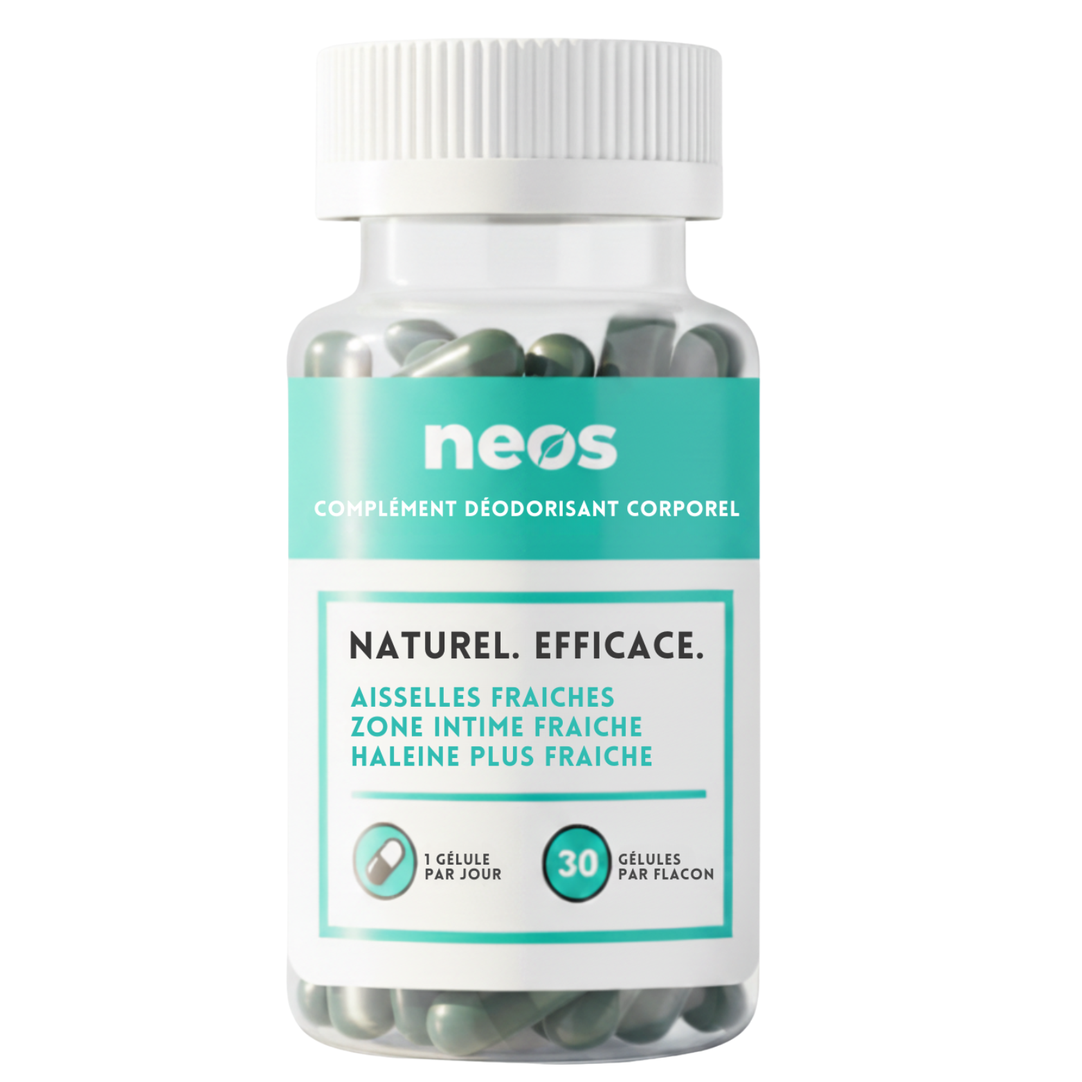 Neos est un complément alimentaire innovant sous forme de capsule qui neutralise et élimine les odeurs corporelles de l’intérieur.